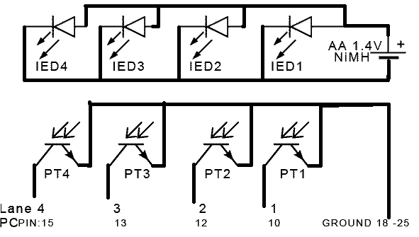 The four 3mm Phototransistors are mounted 55mm bellow in the track, for grater sensitivity you can wire two in parallel for each lane (x8). They act like switches that are normally closed when lined up with the working emitting diodes, pulling the signal lines to ground, when a car passes over them the circuit is broken and parallel port TTL lines go high to 5v. NB: We also have independent rally tracks that all run on incorporated 5Vdc regulators, with 2 LED’s in series(at 2.8V needs a resistor to limit current <100ma) and 2 phototransistors in parallel giving better sensitivity over grater distances, but still using the same software. Components: Maplin YH70M Infrared emitting diode IED x 4(8) Maplin YY66W Phototransistor PT x 4(8) 1.2v (1.4) NiMH AA Battery x 1 * AA battery holder Maplin YR59P * * Replace with 5Vdc 1A regulated system as this can be used to drive track Relays and indicator LED’s(each of the LED's will need a resistor to limit current to <100ma) ![]() HOW TO USE THE PARALLEL PRINTER PORT FOR LIGHTS AND TRACK CONTROL Components: (Maplin part No.) 1 x ULN2803A Darlington Driver (QY79L) 1 x DIL 18 pin socket (HQ76H) 4 x 2A DPDT relay (N17AW) *1 4 x DIL 16 pin socket (BL19V) 4 x 10mm 2.5V Red LED (UK25C) 4 x 430 ohm resister (M430R) *1 *1: To run at 5volts, replace 12Vdc with 5Vdc using a 5V relay, and for the LED replace the 430 ohm resistor with 180 ohm. ![]() | |||